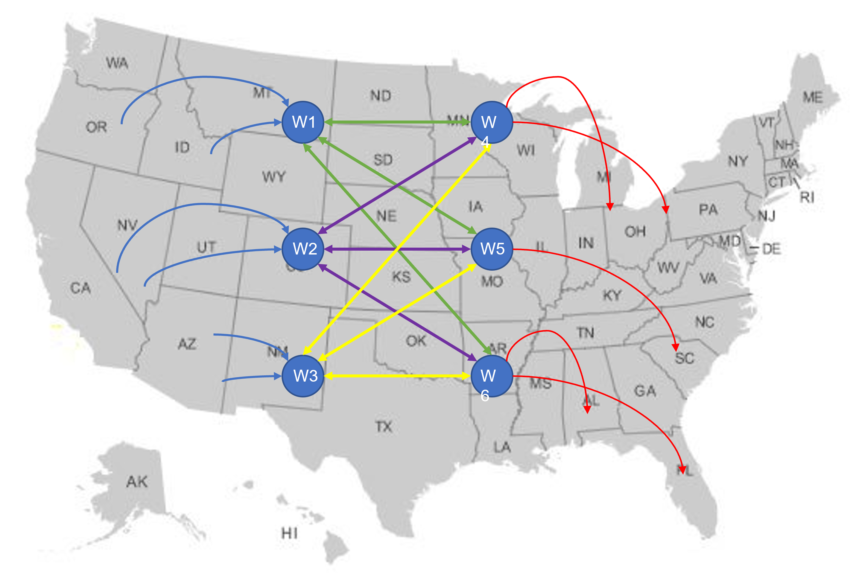 The simplifying overall assumption in the above representation is that the vehicles departing from one base do not arrive to another base from a modeling perspective. This might not hold true in reality but will allow us to solve the optimal staffing level for each base independent of other bases. The assumption will not be limiting as a vehicle departing from one base can still visit other bases, however, their arrival time (or arrival distribution) will be independent of their departure.